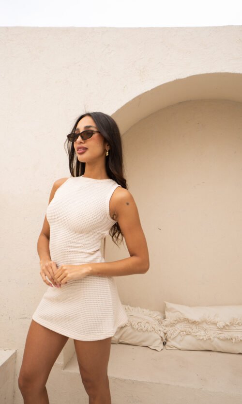 Vestido tejido crochet, espalda descubierta y tiras para atar.