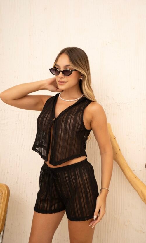 Chaleco tejido crochet con elástico y tiras para atar delantero y en el cuello