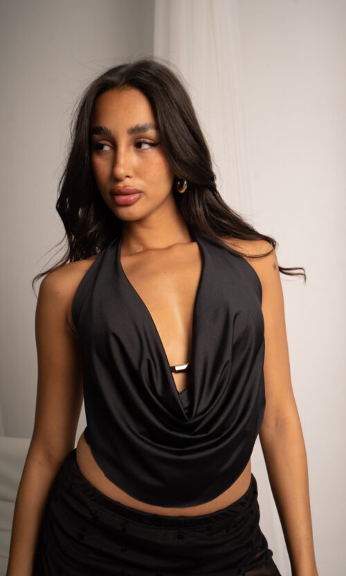 Top Microfibra con accesorio dorado en el centro y elástico en la espalda.