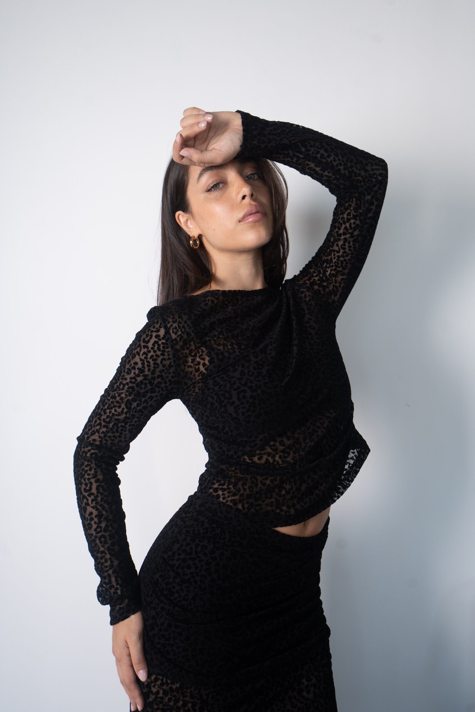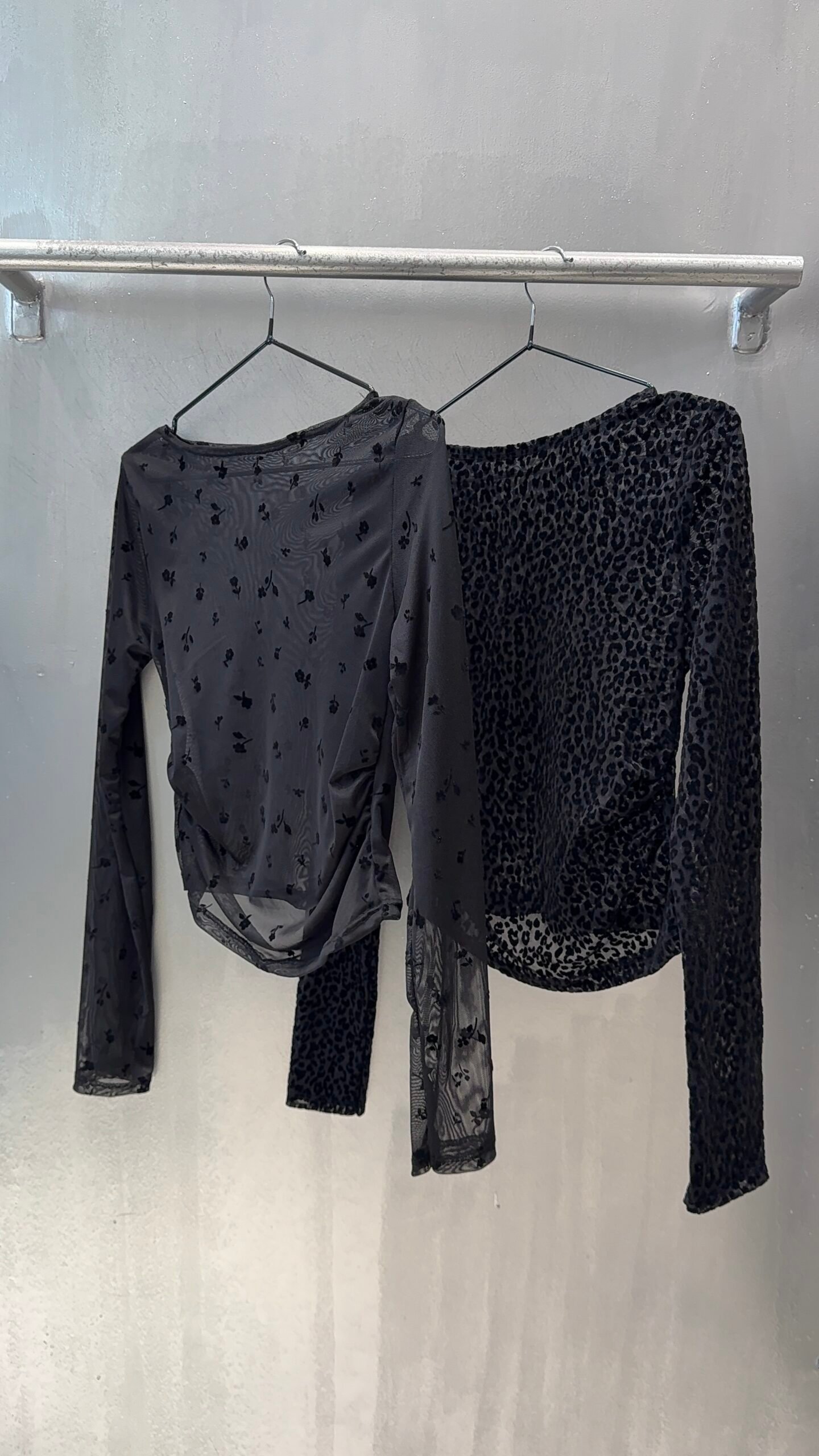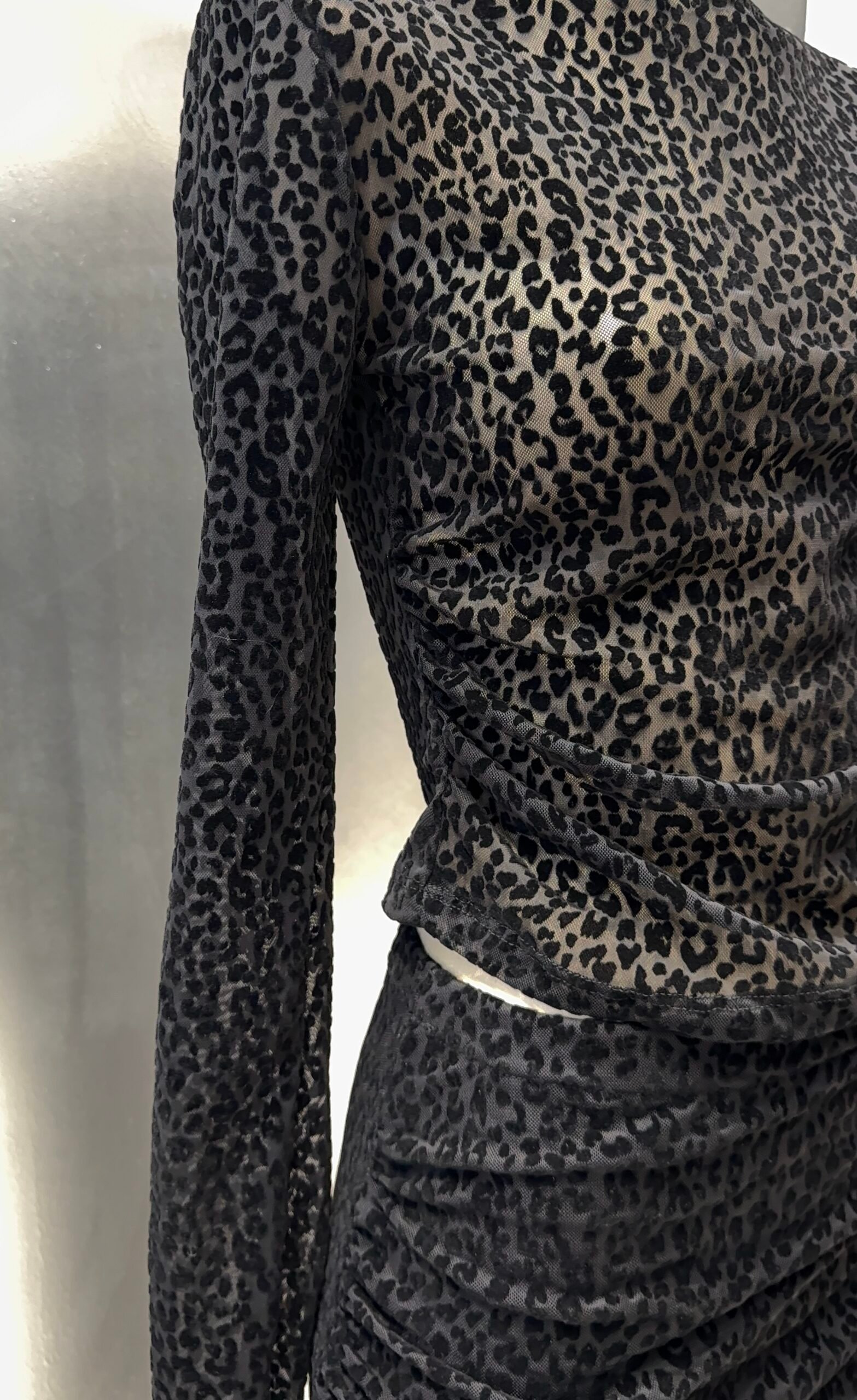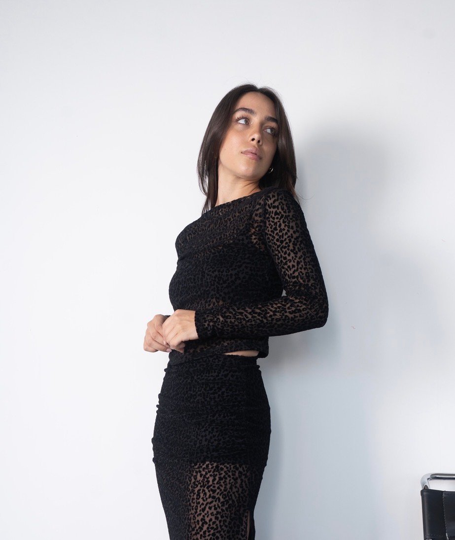 Body tul con flock, con ganchos para abrochar, con mangas acampanadas, sin forrar.