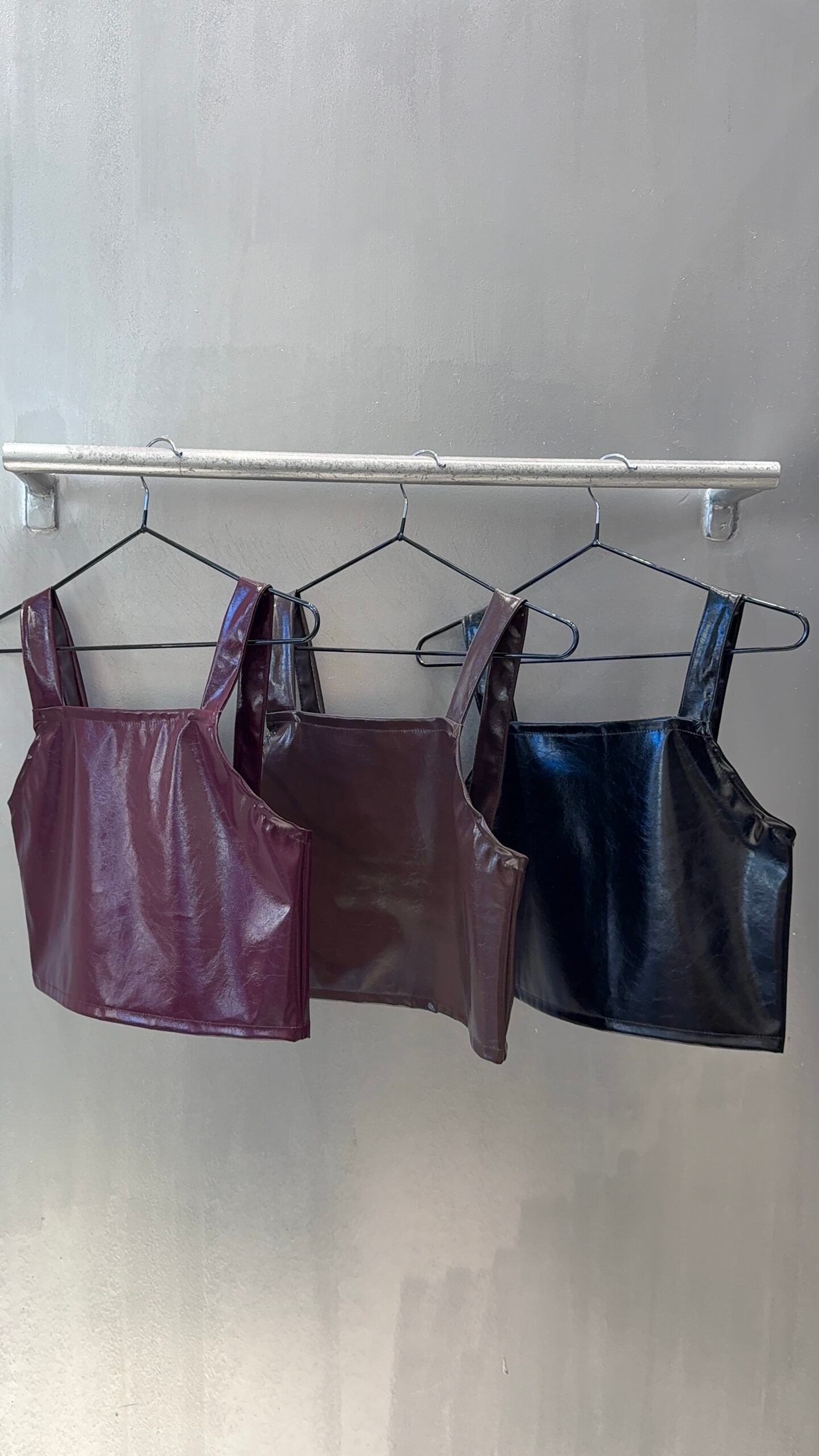 Escote cuadrado con cierre trasero. Esta cuerina es rígida.