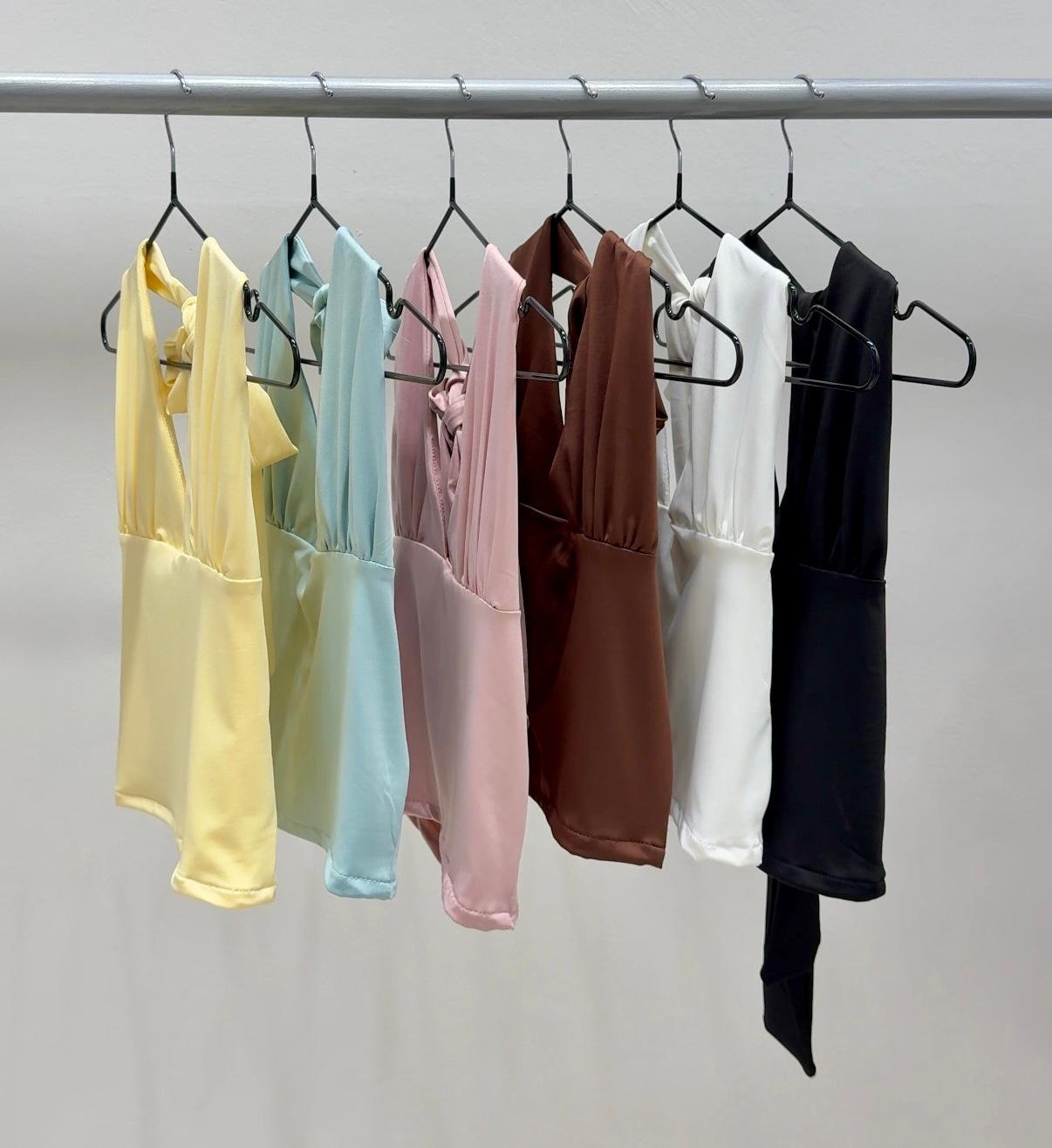 Top abierto, frunce delantero y tazas forradas, breteles regulables y elástico en la espalda.