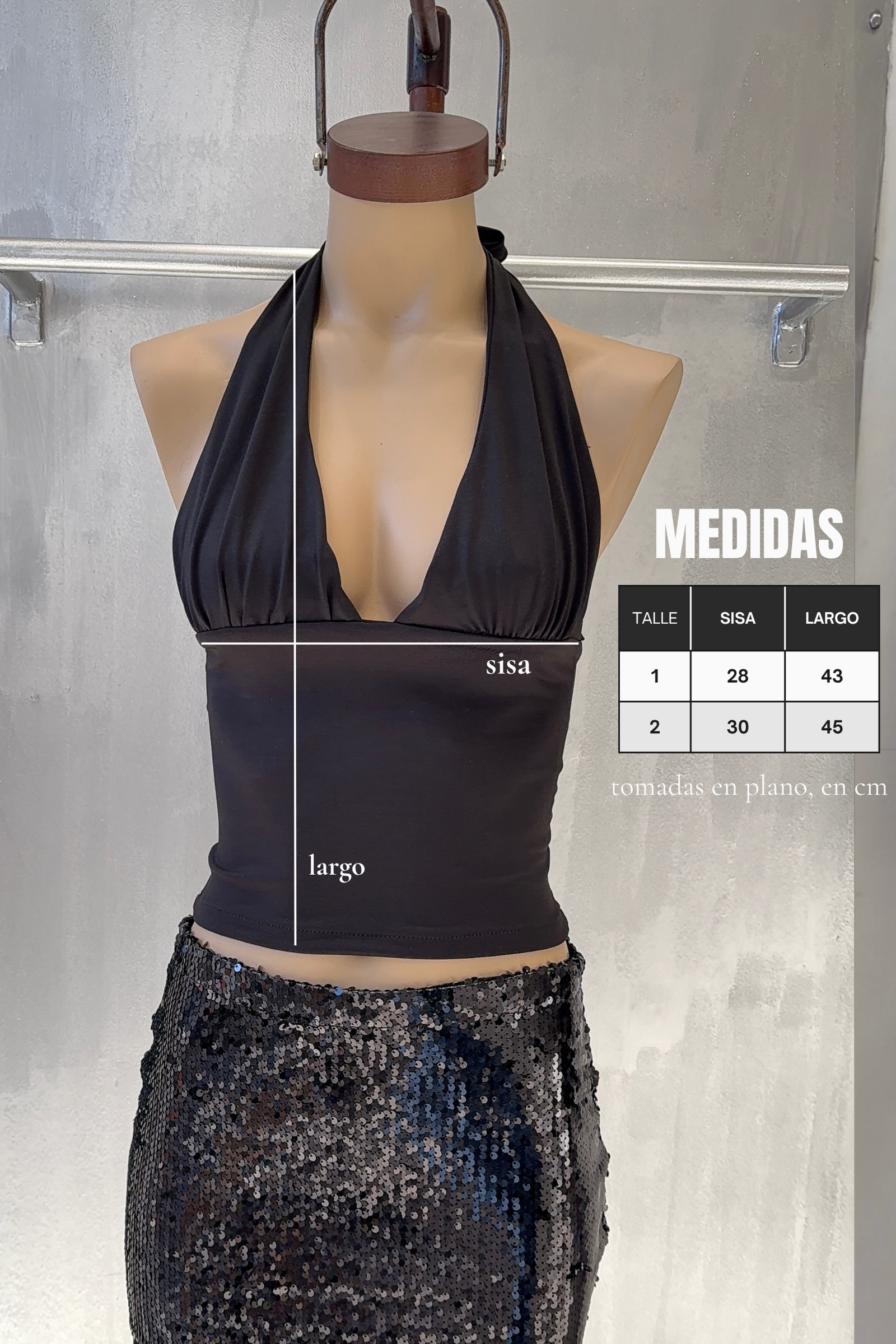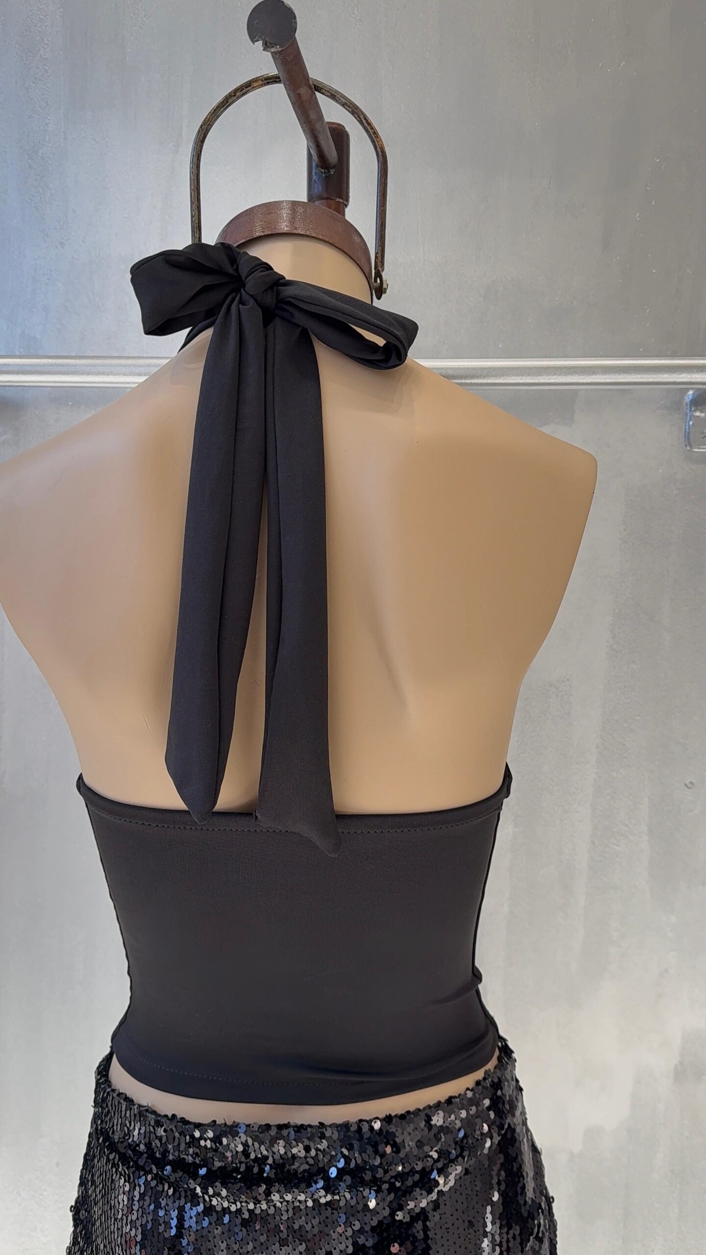 Top de tul con brillos, con tiras para atar en el cuello. Forrado con microfibra.