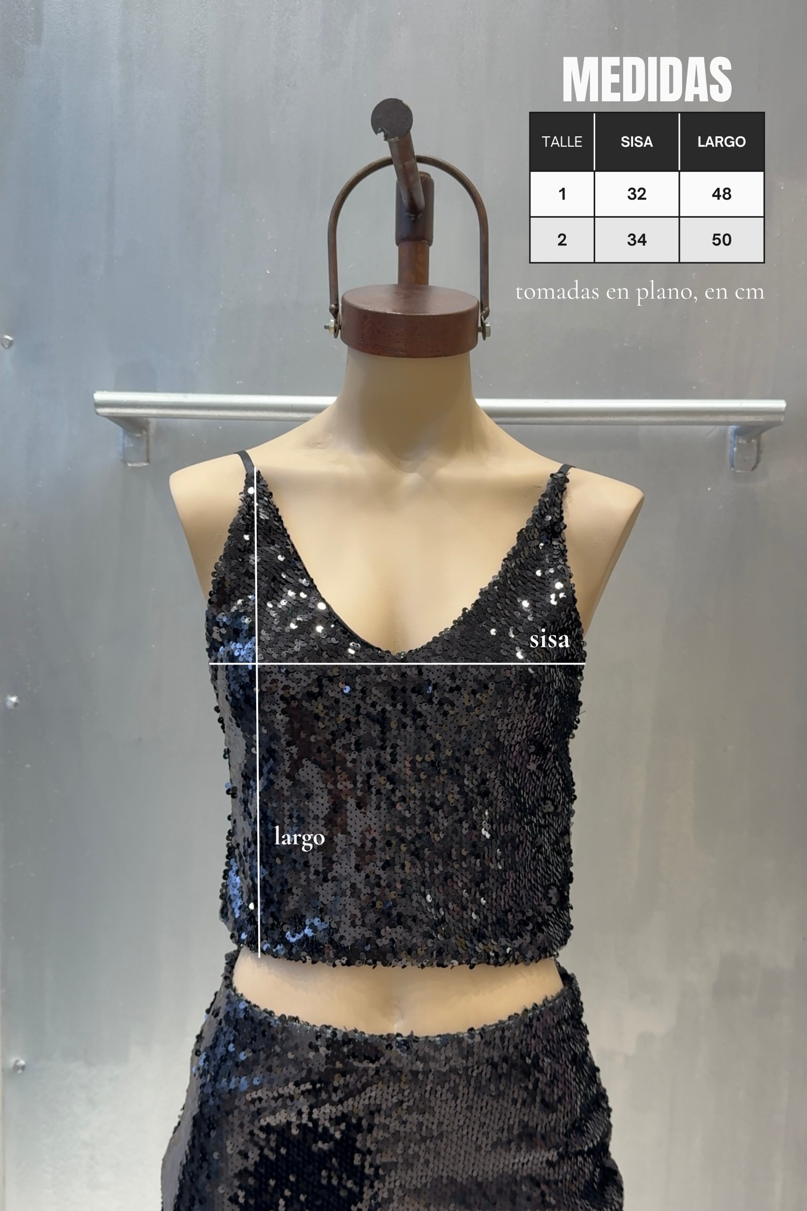 Top lentejuela con microfibra por dentro y breteles regulables (los colores tienen forro y bretel negro)