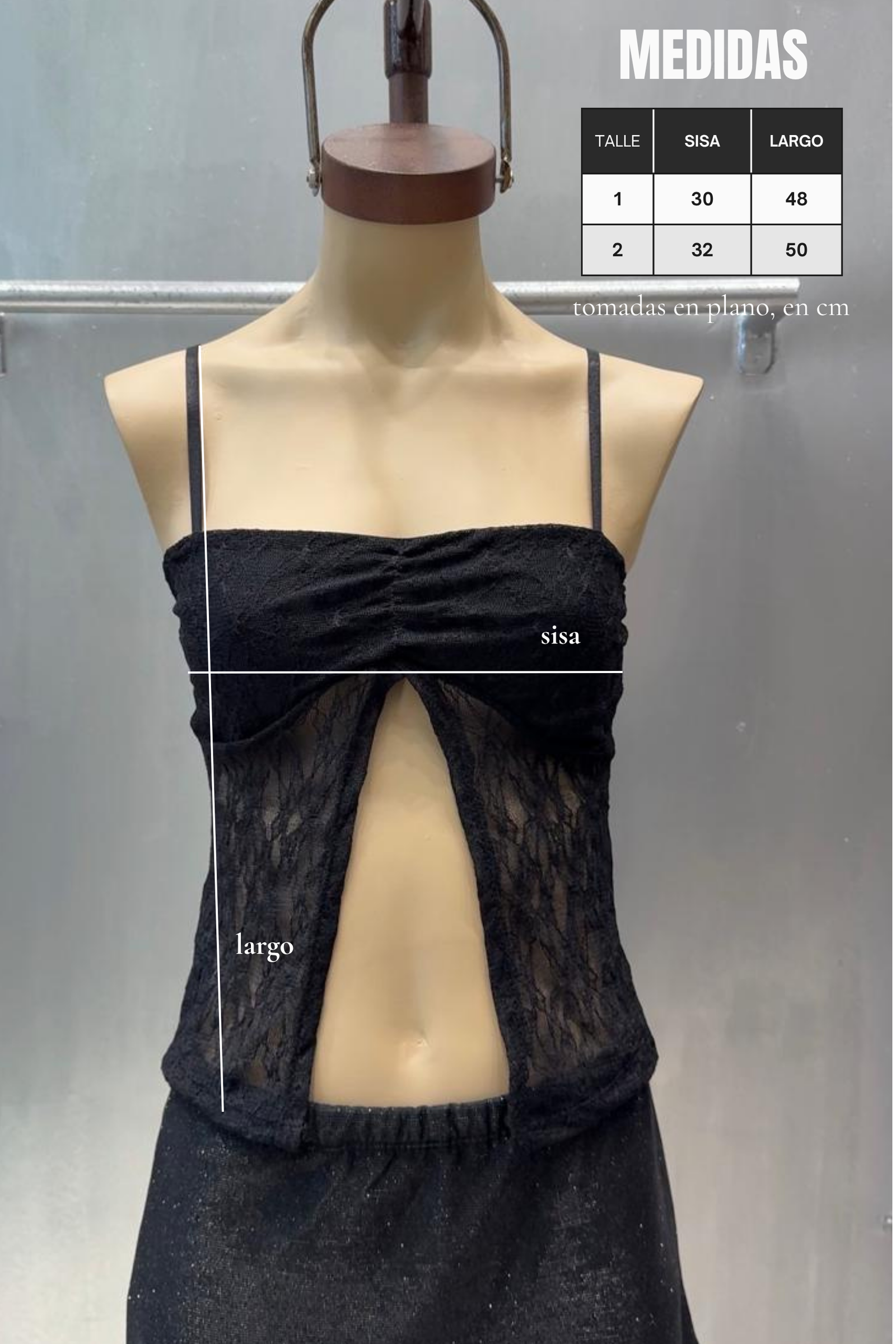 Top abierto, frunce delantero y tazas forradas, breteles regulables y elástico en la espalda.